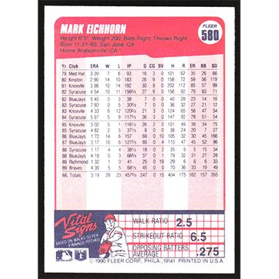 This is a 1990 Fleer Mark Eichhorn baseball card. The card is #580 and pictures show condition.