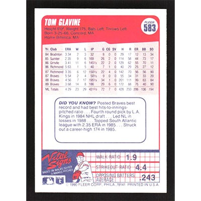 This is a 1990 Fleer Tom Glavine baseball card. The card is #583 and pictures show condition.
