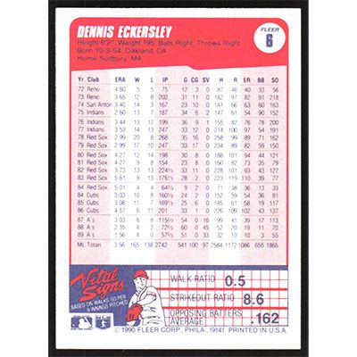 This is a 1990 Fleer Dennis Eckersley baseball card. The card is #6 and pictures show condition.