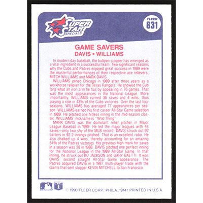 This is a 1990 Fleer Mark Davis and Mitch Williams Super Star Specials baseball card. The card is #631 and pictures show condition. Team(s): San Diego Padres/Chicago Cubs