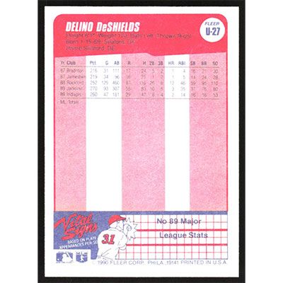 This is a 1990 Fleer Update Delino DeShields baseball card. The card is #U-27 and pictures show condition.