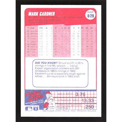 This is a 1990 Fleer Update Mark Gardner baseball card. The card is #U-29 and pictures show condition.