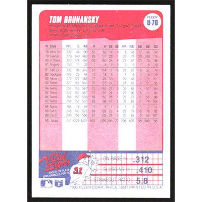 This is a 1990 Fleer Update Tom Brunansky baseball card. The card is #U-70 and pictures show condition.