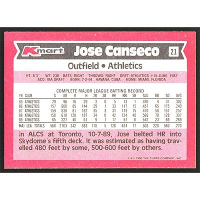 This is a 1990 K-Mart Jose Canseco baseball card. The card is #21 and pictures show condition.