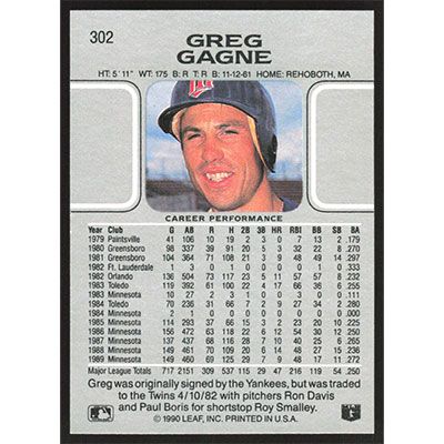 This is a 1990 Leaf Greg Gagne baseball card. The card is #302 and pictures show condition.
