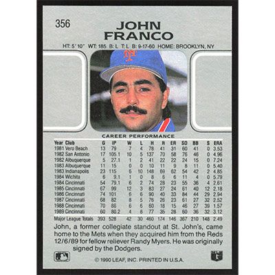 This is a 1990 Leaf John Franco baseball card. The card is #356 and pictures show condition.