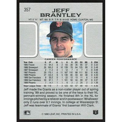 This is a 1990 Leaf Jeff Brantley baseball card. The card is #357 and pictures show condition.