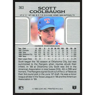 This is a 1990 Leaf Scott Coolbaugh baseball card. The card is #363 and pictures show condition.
