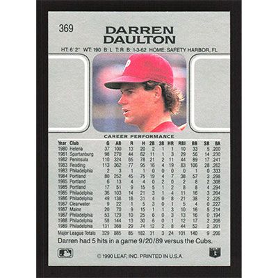 This is a 1990 Leaf Darren Daulton baseball card. The card is #369 and pictures show condition.