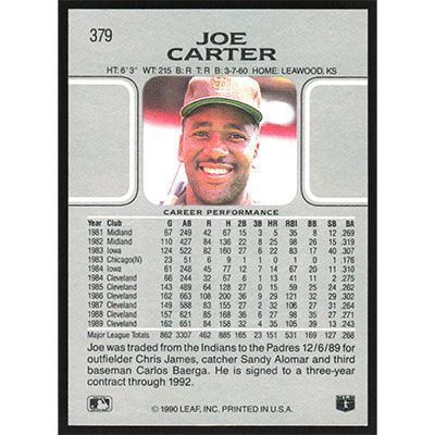 This is a 1990 Leaf Joe Carter baseball card. The card is #379 and pictures show condition.