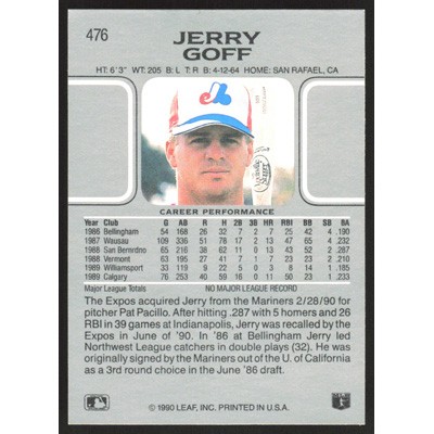 This is a 1990 Leaf Jerry Goff baseball card. The card is #476 and pictures show condition.