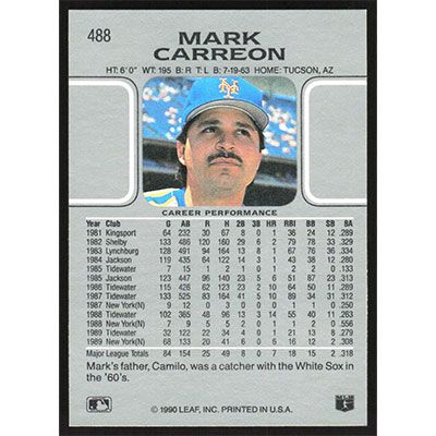 This is a 1990 Leaf Mark Carreon baseball card. The card is #488 and pictures show condition.