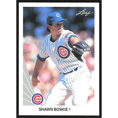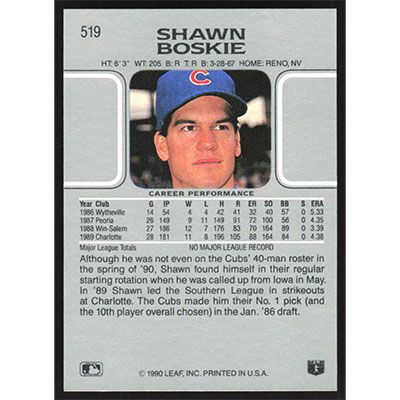 This is a 1990 Leaf Shawn Boskie baseball card. The card is #519 and pictures show condition.