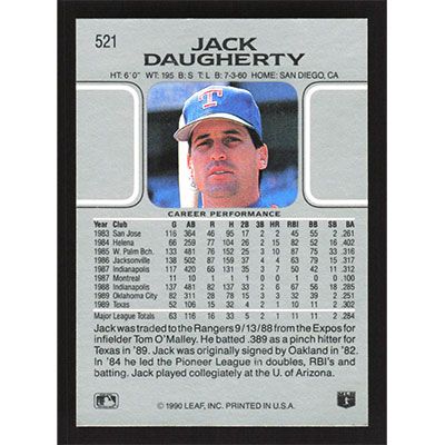This is a 1990 Leaf Jack Daugherty baseball card. The card is #521 and pictures show condition.