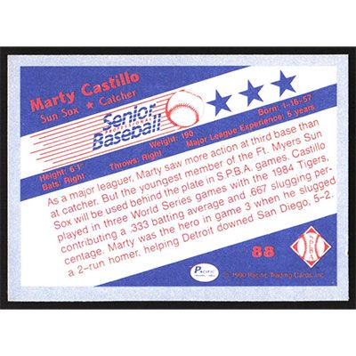 This is a 1990 Pacific Senior League Marty Castillo baseball card. The card is #88 and pictures show condition.
