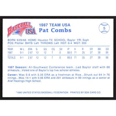 This is a 1990 Pan Am Team USA Red BDK Pat Combs baseball card. The card is #5 and pictures show condition.