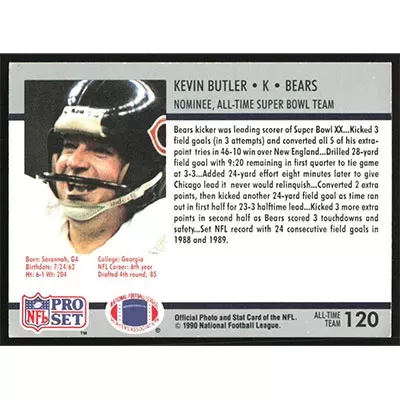This is a 1990 Pro Set Super Bowl 160 Kevin Butler football card. The card is #120 and pictures show condition.