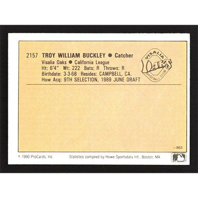 This is a 1990 ProCards Troy Buckley baseball card. The card is #2157 and pictures show condition.