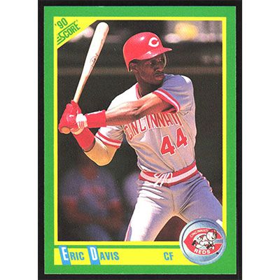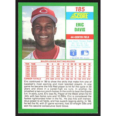 This is a 1990 Score Eric Davis baseball card. The card is #185 and pictures show condition.