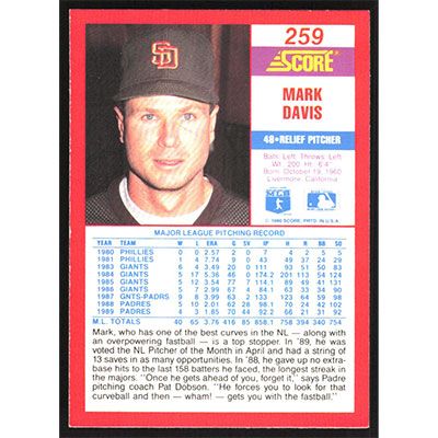 This is a 1990 Score Mark Davis baseball card. The card is #259 and pictures show condition.