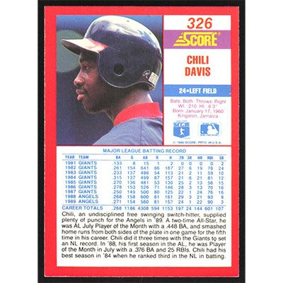 This is a 1990 Score Chili Davis baseball card. The card is #326 and pictures show condition.