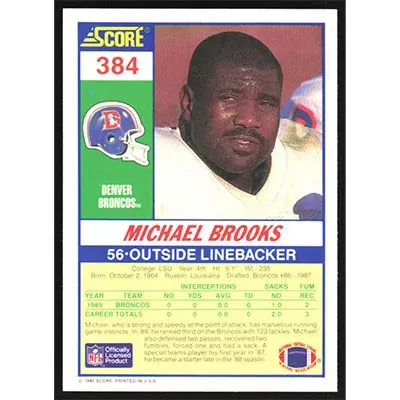 This is a 1990 Score Michael Brooks football card. The card is #384 and pictures show condition.
