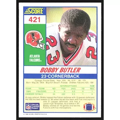 This is a 1990 Score Bobby Butler football card. The card is #421 and pictures show condition.