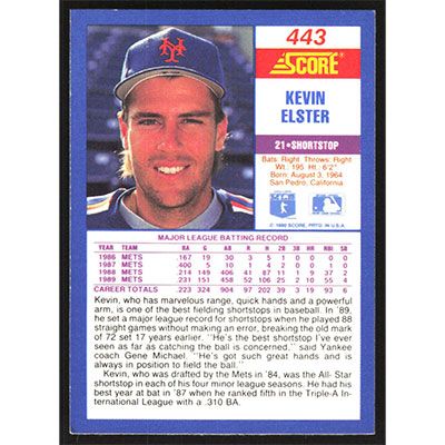 This is a 1990 Score Kevin Elster baseball card. The card is #443 and pictures show condition.