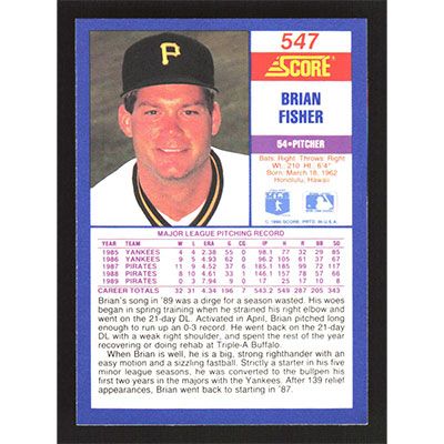 This is a 1990 Score Brian Fisher baseball card. The card is #547 and pictures show condition.