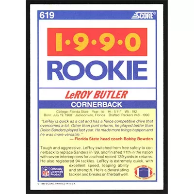 This is a 1990 Score LeRoy Butler football card. The card is #619 and pictures show condition.