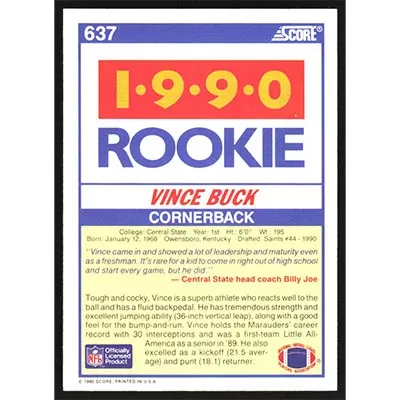 This is a 1990 Score Vince Buck football card. The card is #637 and pictures show condition.