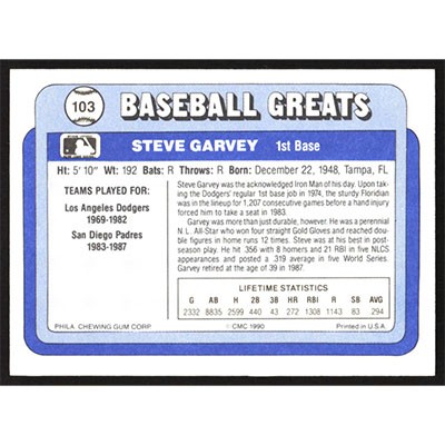 This is a 1990 Swell Baseball Greats Steve Garvey baseball card. The card is #103 and pictures show condition.