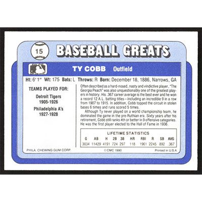 This is a 1990 Swell Baseball Greats Ty Cobb baseball card. The card is #15 and pictures show condition.