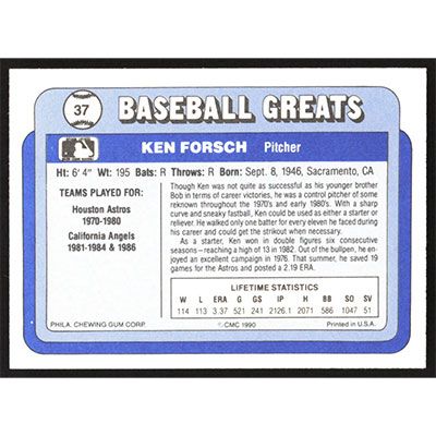 This is a 1990 Swell Baseball Greats Ken Forsch baseball card. The card is #37 and pictures show condition.