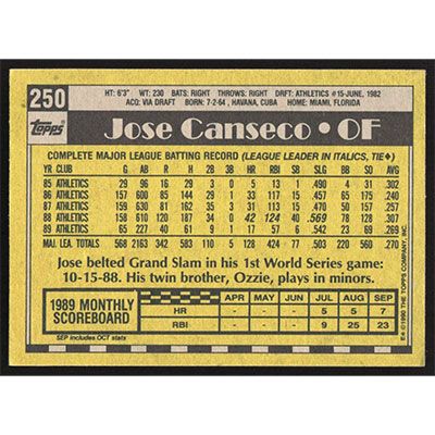 This is a 1990 Topps Jose Canseco baseball card. The card is #250 and pictures show condition.