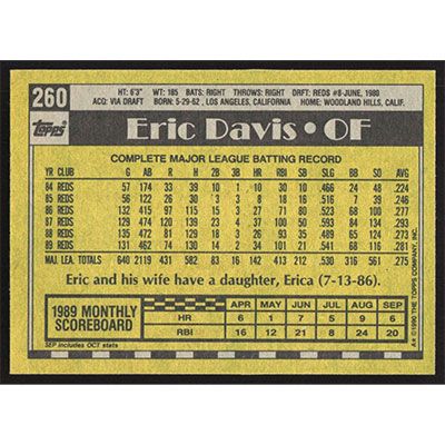 This is a 1990 Topps Eric Davis baseball card. The card is #260 and pictures show condition.