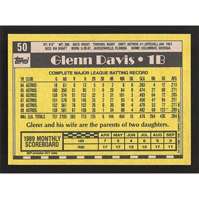 This is a 1990 Topps Glenn Davis baseball card. The card is #50 and pictures show condition.