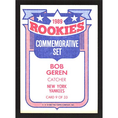 This is a 1990 Topps Rookies Bob Geren baseball card. The card is #9 and pictures show condition.
