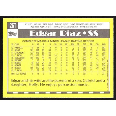 This is a 1990 Topps Traded Edgar Diaz baseball card. The card is #26T and pictures show condition.