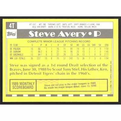 This is a 1990 Topps Traded Steve Avery autographed baseball card. This card has been signed, in blue, by Steve Avery, and is guaranteed authentic by Ballcardz.com. The card is #4T and pictures show condition.