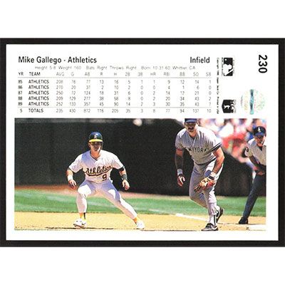 This is a 1990 Upper Deck Mike Gallego baseball card. The card is #230 and pictures show condition.
