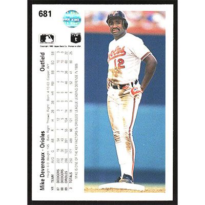 This is a 1990 Upper Deck Mike Devereaux baseball card. The card is #681 and pictures show condition.
