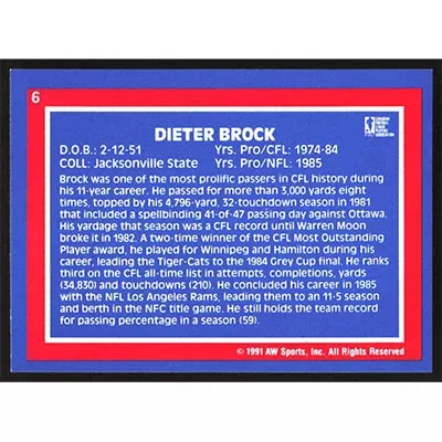This is a 1991 All World CFL Dieter Brock Legends football card. The card is #6 and pictures show condition. Team(s): Winnipeg Blue Bombers/Hamilton Tiger-Cats