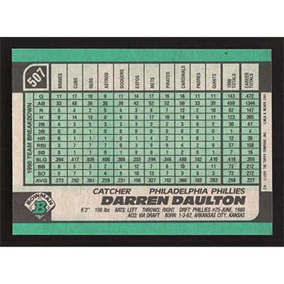 This is a 1991 Bowman Darren Daulton baseball card. The card is #507 and pictures show condition.
