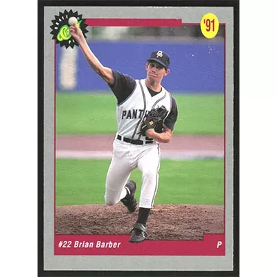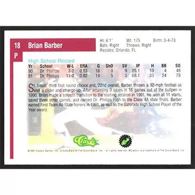 This is a 1991 Classic Draft Picks Brian Barber baseball card. The card is #18 and pictures show condition.