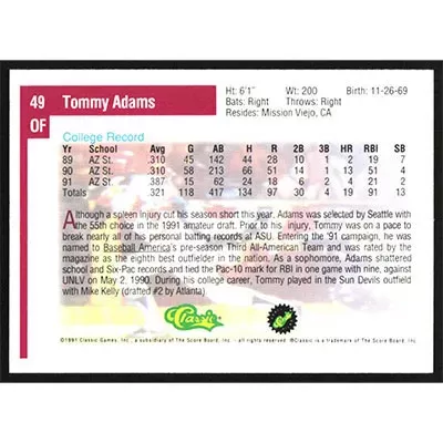 This is a 1991 Classic Draft Picks Tommy Adams baseball card. The card is #49 and pictures show condition.