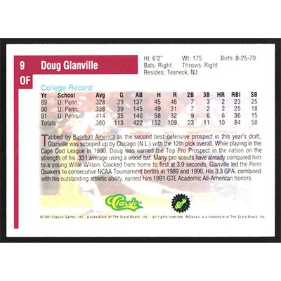This is a 1991 Classic Draft Picks Doug Glanville baseball card. The card is #9 and pictures show condition.