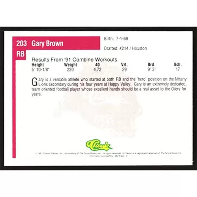 This is a 1991 Classic Four Sport Gary Brown football card. The card is #203 and pictures show condition.