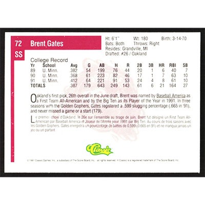This is a 1991 Classic Four Sport Brent Gates baseball card. The card is #72 and pictures show condition.