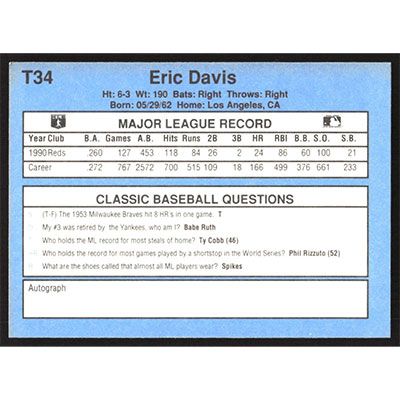 This is a 1991 Classic I Eric Davis baseball card. The card is #T34 and pictures show condition.
